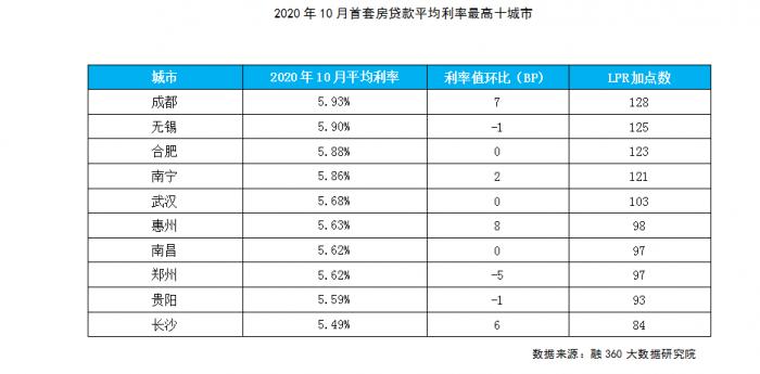 10月14日,央行在第三季度金融统计数据发布会上表示,房企融资新规反响积极正面,将会同住建部和其他相关部门,跟踪评估执行效果,稳步扩大适用范围。前十高城市中,长沙地区本月首套房贷利率环涨6BP,为5.49%,进入全国房贷利率前十高城市,沈阳则被挤出名单。另外,成都地区房贷利率再次上调,一跃成为全国房贷利率最高城市,达到5.93%,无锡、合肥顺则顺位下降。