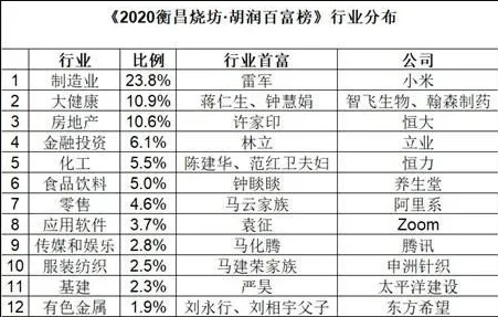 从胡润百富榜行业分布来看,前三大分布行业依次为制造业(23.8%)、大健康(10.9%)、房地产(10.6%),说明这三大行业仍是驱动龙头行业。