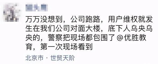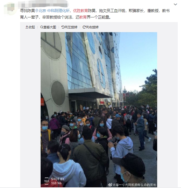 据财新报道,2020年10月19日,北京优胜教育总部,前来退费的学生家长,以及被拖欠工资的优胜教育员工聚集维权。据前来维权的家长介绍,上午来维权的人最多,可达3~4千人。