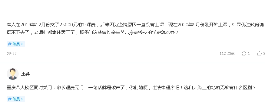 与此同时,有网友爆料称优胜教育接近破产,有校区老师称公司已拖欠薪资长达半年,家长们缴纳的补课费用也无处可退,涉及金额高达上千万元。