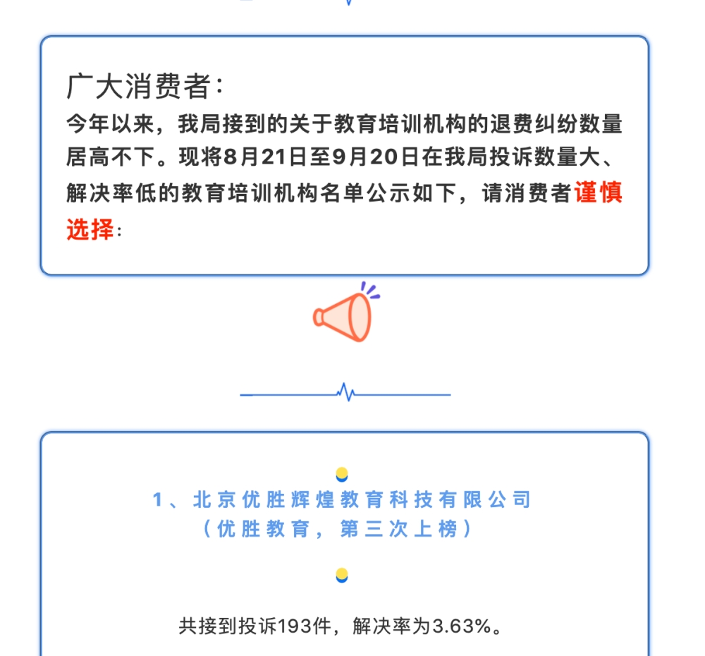 近期,最近,北京海淀市场监管局发布消费预警,曝光当地教育培训行业投诉率高的机构。其中,优胜教育高居黑榜榜首,这已是该机构第三次上榜,投诉案件最多,解决率最低,仅有3.63%。