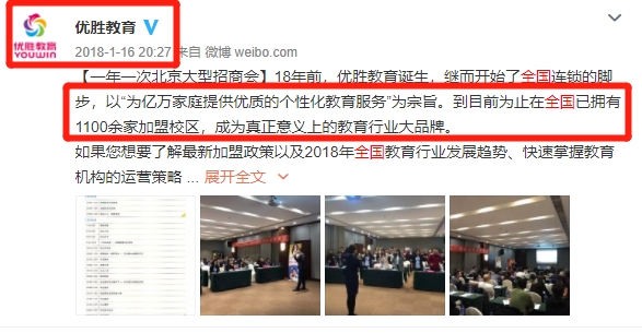 根据其官微,优胜教育在2018年初便在全国拥有超1100家校区。