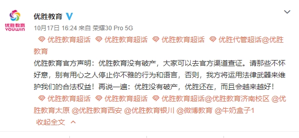 值得注意的是,10月17日,优胜教育官方声明,优胜教育没有破产,请那些不怀好意,别有用心之人停止你不雅的行为和语言,会用法律武器维护自己合法权益。
