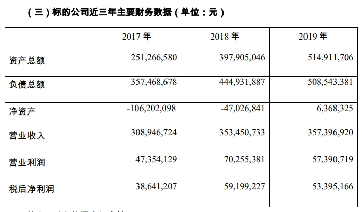根据当时公告,优胜腾飞2017年至2019年三年间,资产总额从人民币2.51亿元增长至5.14亿元,负债总额从3.57亿元增长至5.09亿元。2019年,其营业收入达3.57亿元,营业利润仅为5739万元。