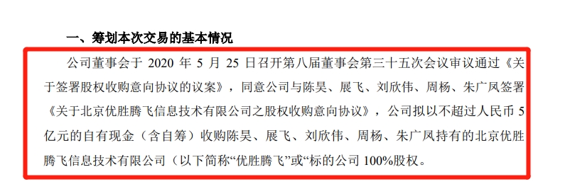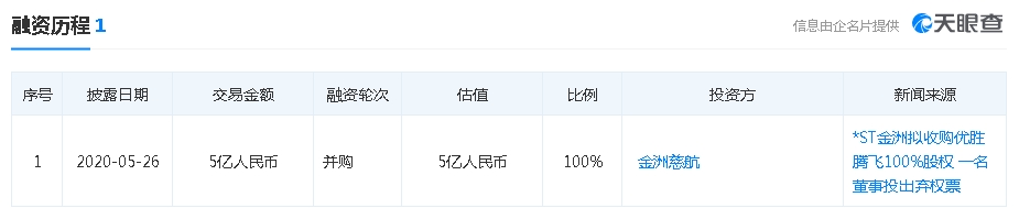 2020年5月26日,上市公司金洲慈航(*ST金洲,000587.SZ)发布公告,称已签署意向协议,拟以不超过人民币 5 亿元的自有现金(含自筹)收购陈昊等持有的北京优胜腾飞信息技术有限公司100%股权,