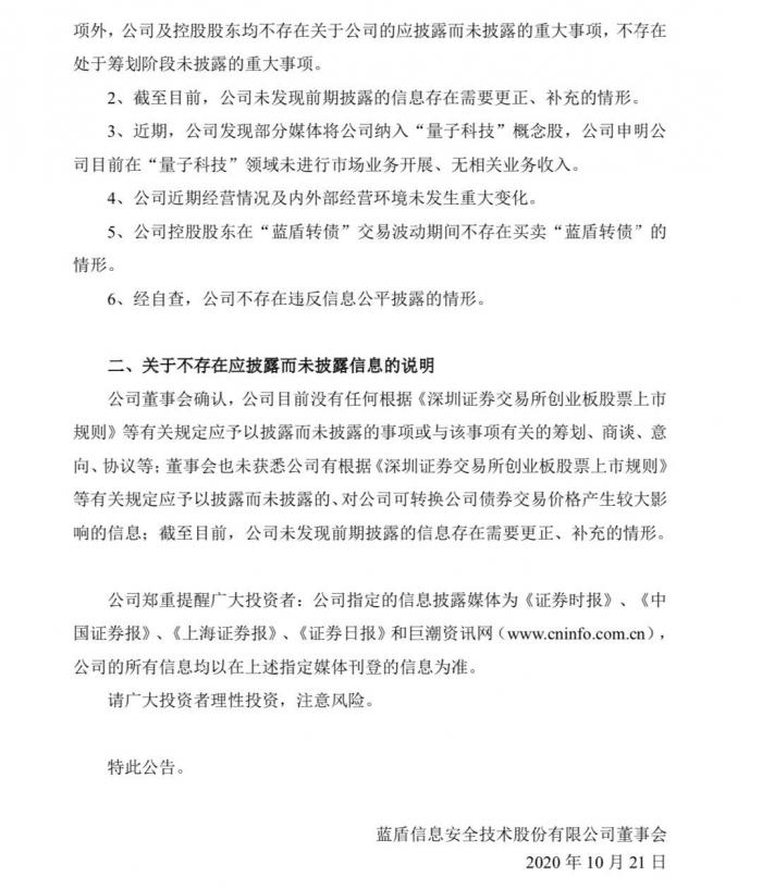 10月20日晚间,蓝盾股份(300297)发布公告称,近期,公司发现部分媒体将公司纳入“量子科技”概念股,公司申明公司目前在“量子科技”领域未进行市场业务开展、无相关业务收入。