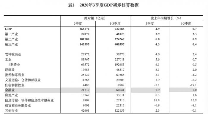 国家统计局10月20日公布的三季度GDP初步核算数据显示,三季度金融业增加值增速为7.9%,增速仅次于信息传输、软件和信息技术服务业和建筑业。从绝对额看,三季度金融业增加值为2.17万亿,约占同期GDP的8.15%。