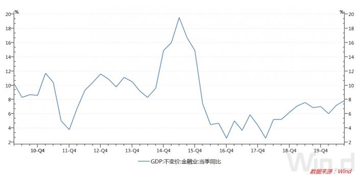 此前,金融业增加值增速高点出现在2014-2015年。2014年四季度至2015年四季度,金融业增加值各季度同比增速均超过14%。2016年开启金融去杠杆之后,增速回落至个位数,在2018年一季度最低降至2.6%。今年二季度增速达到7.2%,三季度进一步上升至7.9%。