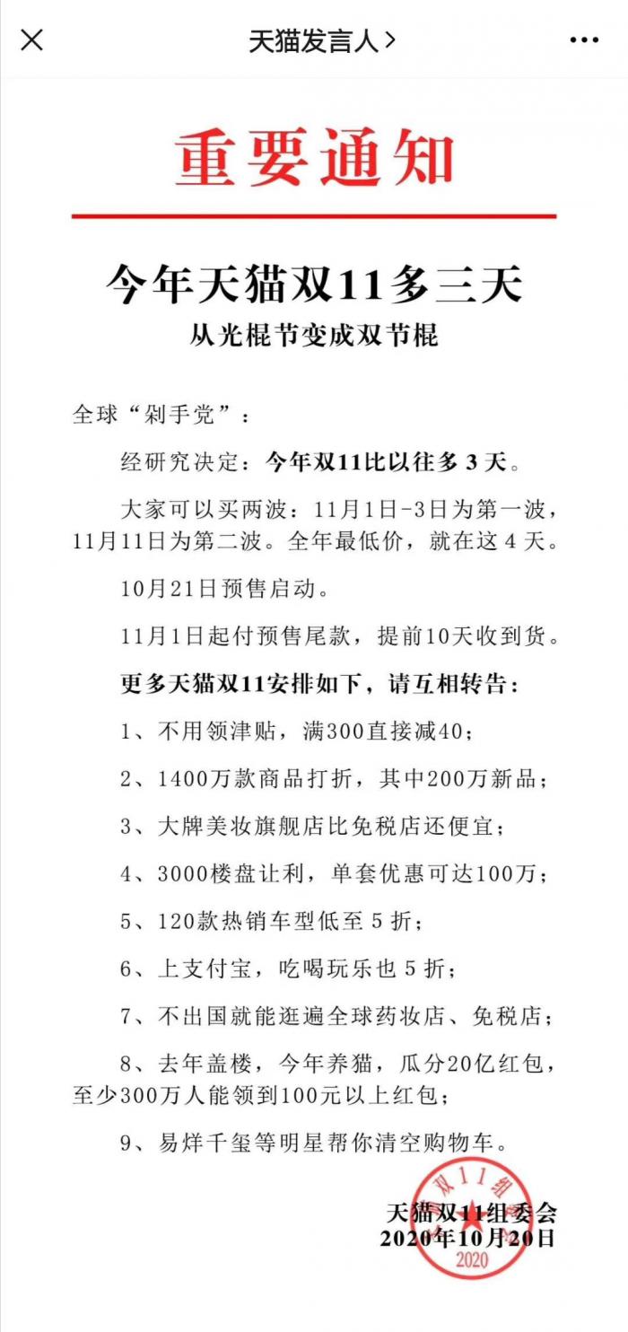 10月20日,天猫宣布:10月21日,双11启动预售,今年消费者可分两波购买,11月1日-3日是第一波,11月11日为第二波。这意味着,今年双11比往年多了3天,消费者在11月1日就可以付预售商品的尾款,提前10天收到货。今年天猫双11的规模再创纪录:共有25万品牌,500万商家参与双11,其中包括200万线下商家。参与双11折扣的商品超过1400万款,是去年的1.4倍。预计将有8亿消费者参与此次双11,创造今年最大的消费爆发。