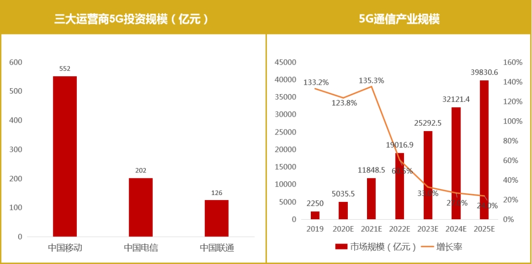 在5G投资方面,中国移动优势明显。上半年三家运营商5G投资开支共880亿元,中国移动552亿元,全年计划投入1050亿元;中国电信和联通则仅为202亿元和126亿元。截至2020年6月底,中国移动在超过50个城市累计开通18.8万个5G基站。而中国联通和电信采取了5G网络共建共享的模式,上半年共新建共享基站15万个,数量上接近中国移动。