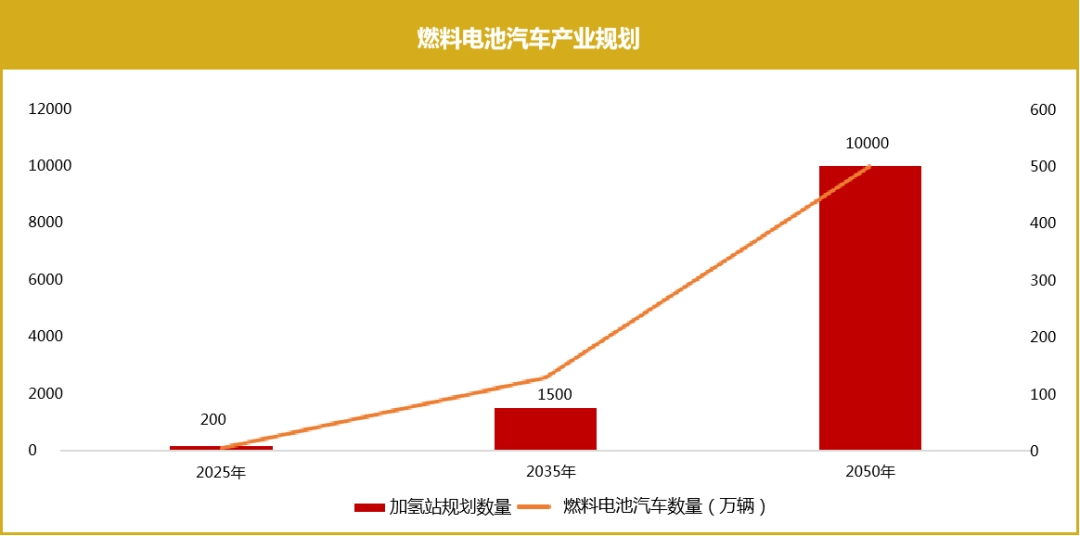 《发展规划》提出的燃料电池汽车示范应用措施,促进燃料电池汽车产业增长,以及核心材料、关键零部件、加氢站等产业加速建设进程,氢燃料电池汽车产业会逐渐形成良好的配套产业链。当前我国燃料电池汽车主要还是以货运车辆为主,相关配套产业还处在起步阶段,但长期规划已有雏形,对促进汽车整车以及零部件行业提供增量。