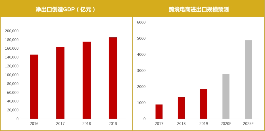 市场规模不断扩大,2018年我国跨境电商零售进出口额突破1000亿元,2019年则达到1862.1亿元,截至2020上半年中国跨境电商进出口交易规模在疫情的大环境下逆势增长26.2%,是唯一保持正增长的贸易方式,远高于外贸整体增速。