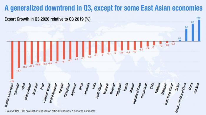 10月21日,联合国贸发会议发布全球贸易季度更新报告指出,今年第三季度全球贸易额与去年同期相比减少5%,与第二季度19%的下降相比,出现小幅反弹,但仍不足以重回增长区间。在主要经济体中,中国一枝独秀,实现了近10%的同比增长。