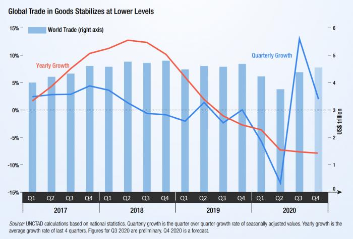 联合国贸发会议表示,初步预计今年第四季度全球贸易额的同比降幅将进一步收窄至3%,全年平均贸易额与去年相比将减少7%-9%左右,但这一预测数字仍然存在不确定性,取决于疫情的发展走向,以及未来数月内的经济活动情况。