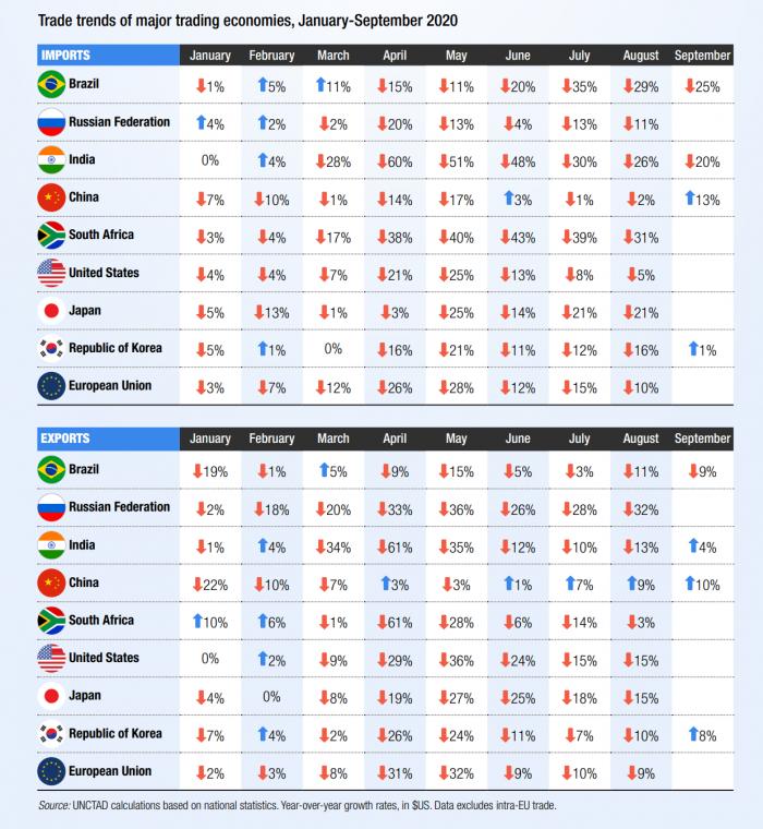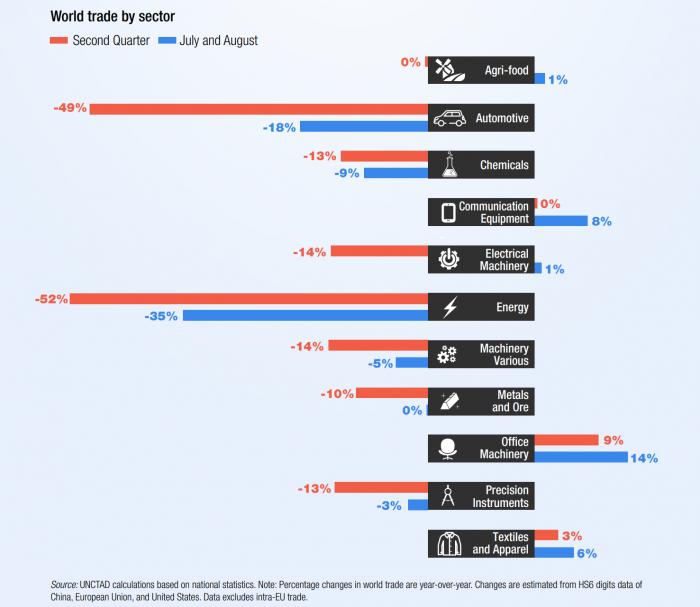 联合国数据显示,发展中国家的贸易降幅从第二季度的-18%缩窄为七月的-6%,而发达经济体的两项数据分别为-22%和-14%。