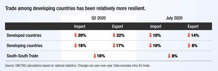贸发会议指出,今年第二季度,国际贸易因新冠疫情受到严重冲击,全球所有区域均未能幸免,但西亚和南亚的跌幅最为严重,进出口额分别回落了35%和41%。截至七月,除东亚以外的全球各区域贸易下滑仍然十分严重。