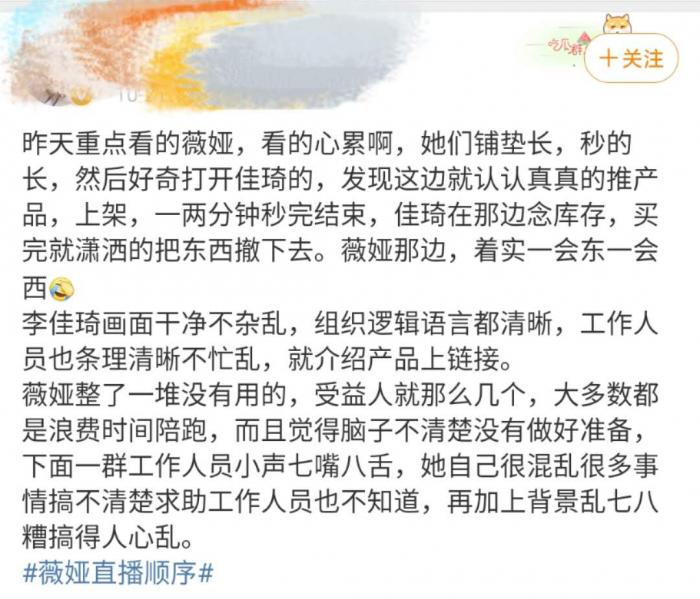 目前,薇娅微博粉丝数为1364万,李佳琦微博粉丝数为2052万;昨晚两个直播间观看人数均超1亿,差距并不大。网友表示,更偏好李佳琦的原因在于李佳琦整场直播的把控能力更突出,直播间销售的品类更清晰,能让观众感受到他的认真和亲切。相比之下,薇娅的直播间稍显混乱。有网友透露,昨晚她蹲的一个产品在薇娅还没介绍的情况下,链接自动开了,凌晨有一段时间节奏完全乱掉了。当然,网友对薇娅的直播顺序褒贬不一。有人称,薇娅直播也同步过直播顺序。