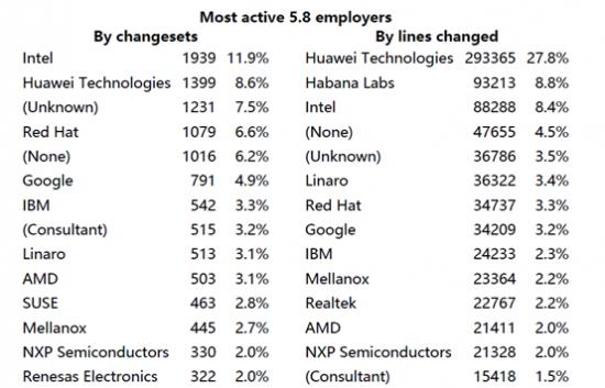于是,我们看到了在最新发布的Linux Kernel 5.8版本中,华为一跃成为内核代码贡献排名第二。