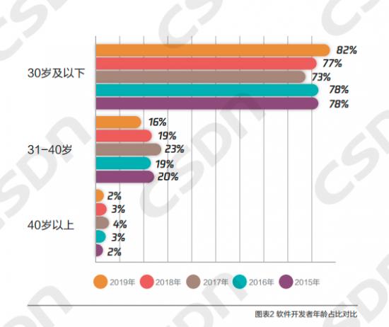 根据CSDN发布的《2019-2020中国开发者调查报告》显示,目前全国30岁以下开发者人数占比超8成,达到82%,这个数据在2018年还只有77%。