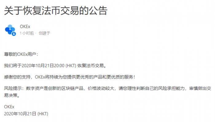 中国最第二大,也是全球第二大的数字货币交易平台OKEx公告称,将于2020年10月21日20时(HKT)恢复法币交易。消息公布后,OKB虚拟币涨近10%。