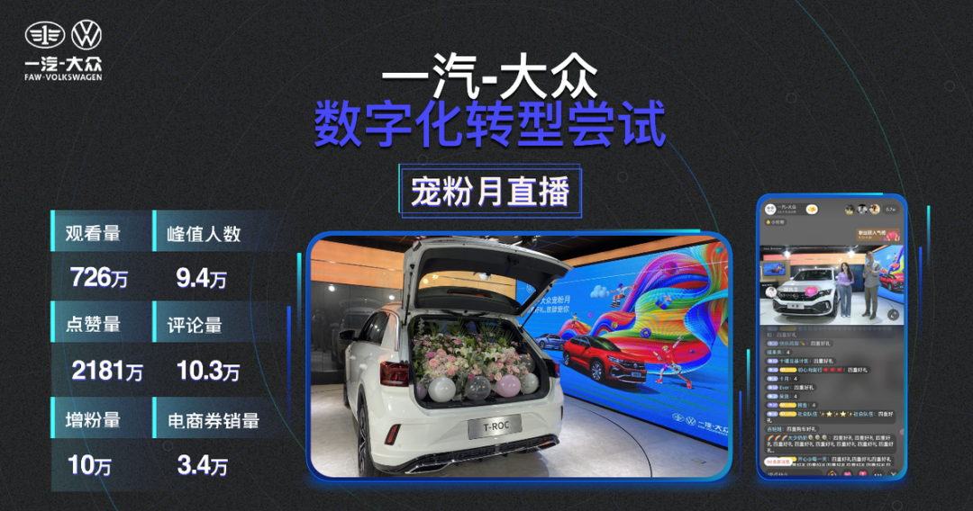 例如在宠粉月活动中,大规模的直播观看人数,为一汽-大众带来了超过3.4万个线上订单。在汽车界这个销量相当于新能源车前几名的月销量之和。