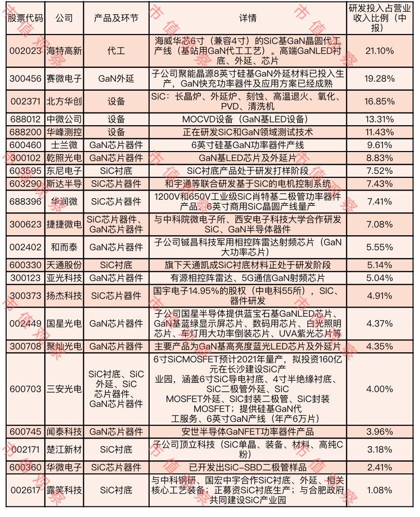 而公司对研发的投入能侧面反映出其对于技术发展的重视程度,基于此,市值观察梳理了国内涉足第三代半导体的主要上市公司,并按照研发投入占营业收入比例(中报)排名,以供投资者参考。