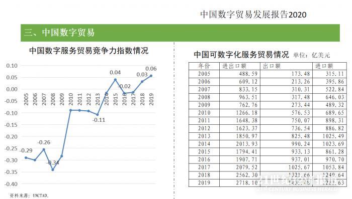 报告称,中国数字贸易增长迅速,近年来形成了顶层设计和一系列政策部署,中国可数字化服务贸易额已由2005年的488.59亿美元,升至2019年的2718.10亿美元。中国数字服务贸易竞争力指数也由2008年的-0.34攀升至正值,并在2019年达到0.06的新高。在此背后,中国数字服贸在多个领域取得了长足的发展。