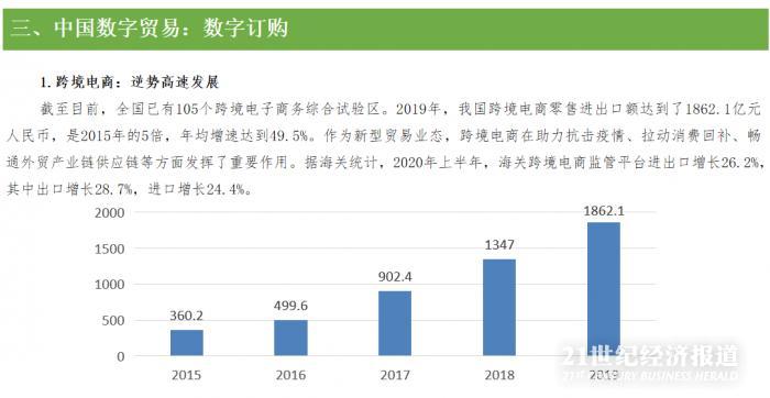 在跨境电商上,报告指出,截至目前,全国已有105个跨境电子商务综合试验区。2019年,中国跨境电商零售进出口额达到了1862.1亿元人民币,是2015年的5倍,年均增速达到49.5%。