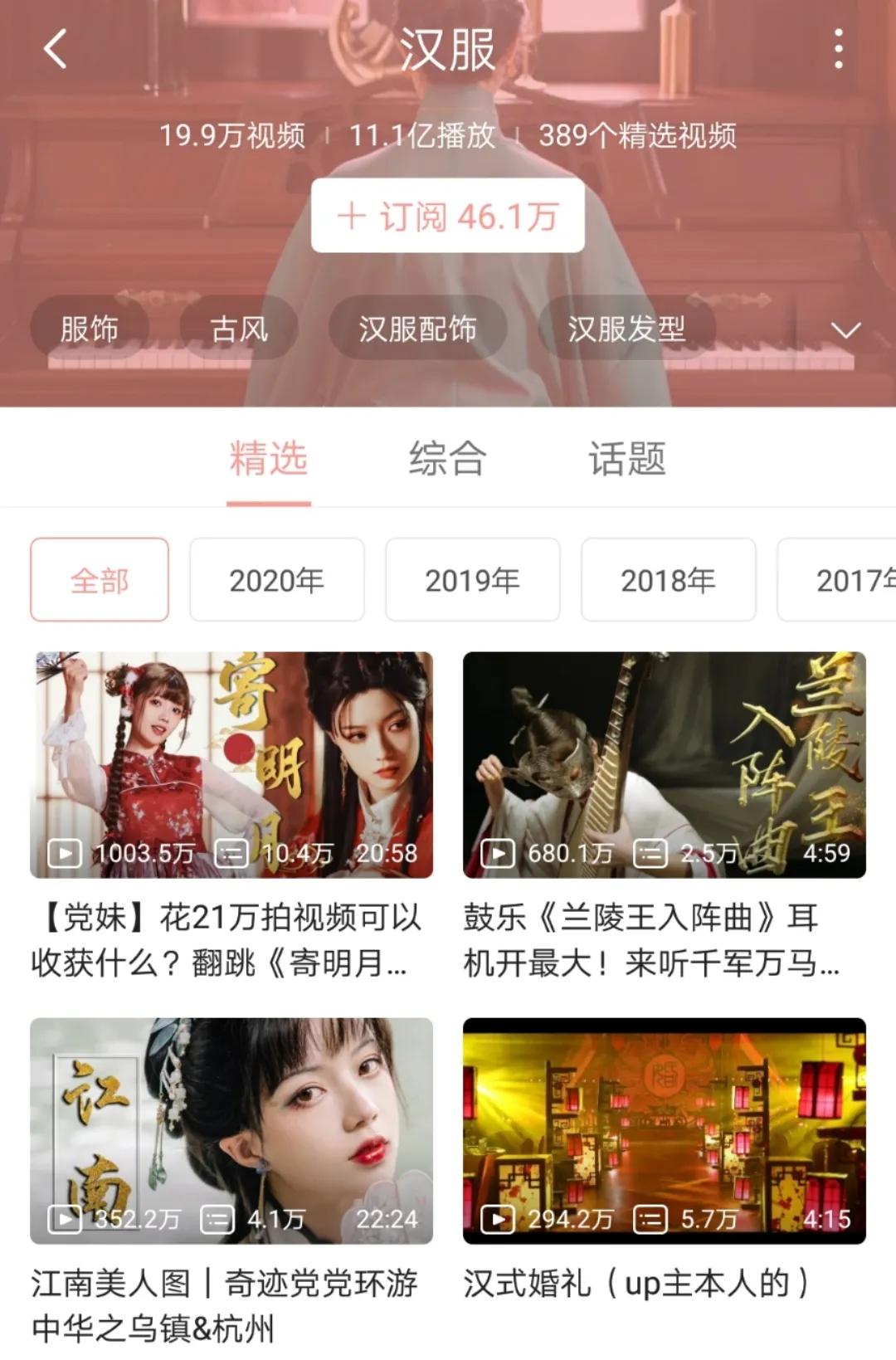B站,既是二次元、亚文化的聚集地,也是汉服爱好者的社交活跃场和内容生产平台。在B站首页搜索「汉服」关键词,进入汉服频道,显示近400个精选视频,多为头部UP主们的UGC生产,视频播放量累计11.1亿次,订阅数46万,话题栏浏览量1.6亿,讨论活跃量83万+。
