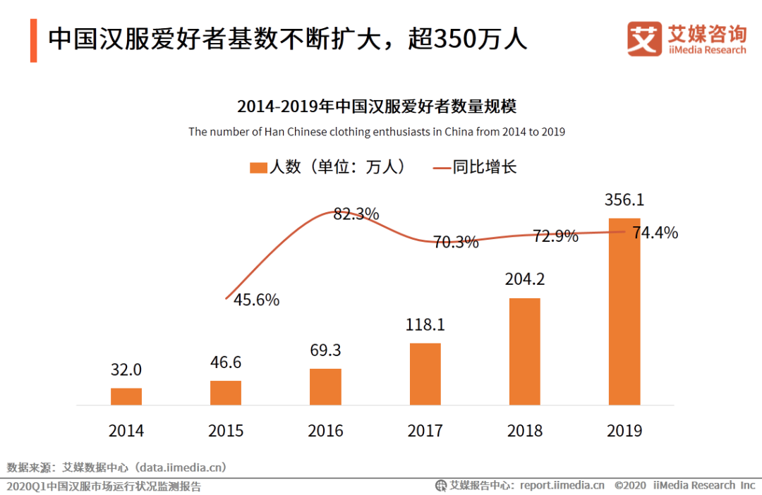 据艾媒咨询数据,2018年中国汉服爱好者人数已达204.2万人,同比增长72.9%,2019年汉服爱好者已达356万人,同比增长74.4%。2017-2019年间,全球汉服文化社团数量增长53.8%。