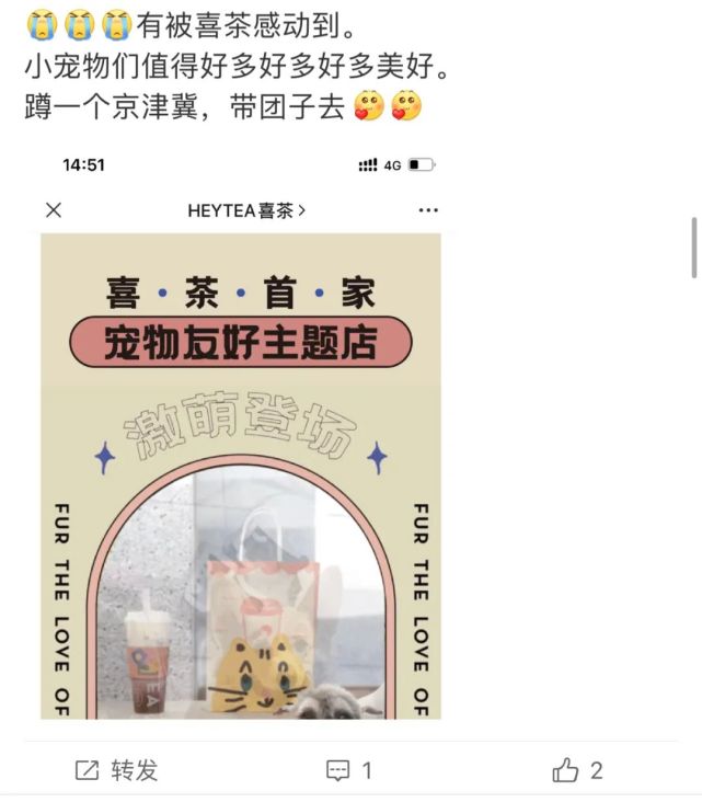 比如喜茶的宠物友好主题店,通过线下门店的打造,接着制造线上社交话题,利用线上社交媒体传播,再吸引用户到线下门店体验。用户再将线下的体验过程和感受等内容素材进行线上再传播,以此不断扩大传播范围,吸引更多年轻用户的关注和讨论。