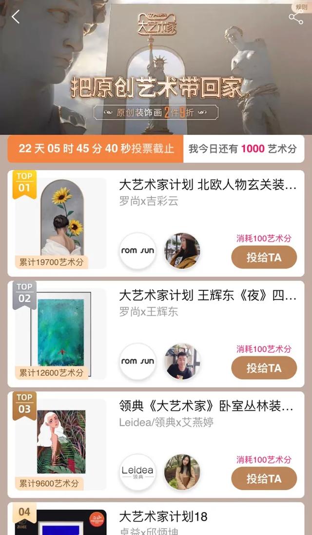 为了满足市场对原创家居的需求,天猫家居联合阿里原创保护平台发起“大艺术家计划”,联合四川美术学院、湖北美术学院和鲁迅美术学院共同征集原创设计作品。截止目前,第一期活动已经收到超过八百个投稿作品,评委会选出的50幅画作品将作为签约作品在天猫平台上进行消费者投票。