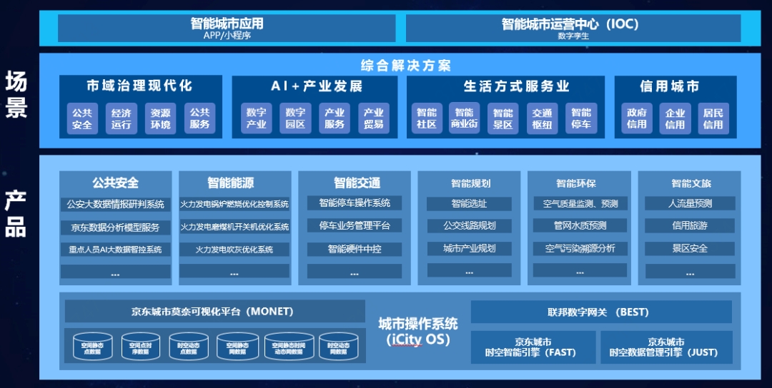 目前,京东数科智能城市在底层“城市操作系统”的基础上,已经构建了智能交通、智能能源、公共安全等垂直类产品以及信用城市、AI+产业发展、智能停车、智能园区和智能城市APP等场景化解决方案,形成了支撑智能城市开放生态的产品阵列。