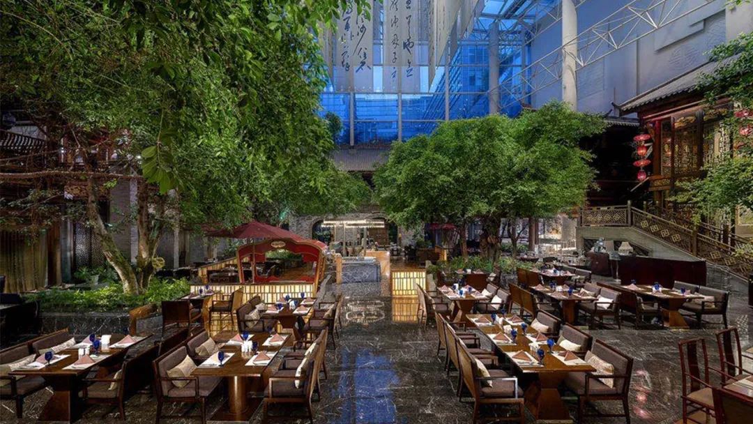 一座颇具川西建筑特风格的茶馆立于厅内,与名家字画互相呼应。厅中树木拔地而长,承接地气,似将成都街边的川西茶文化引入当代都市生活之下,区别于其它酒店千篇一律的富丽堂皇。