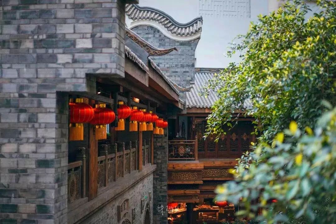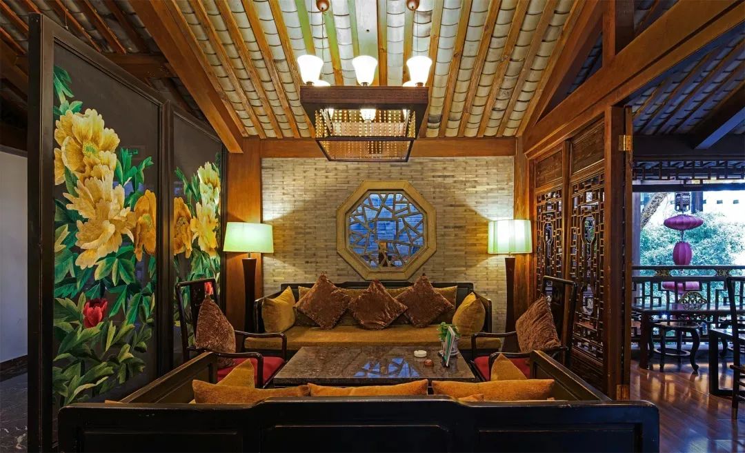 青灰色的砖瓦墙壁、茶褐色的木质门窗,朴素淡雅,与室内外的点点绿植相映成趣,自成一派飘逸风格。木穿斗结构,斜坡顶、薄封檐,开敞通透,轻巧自如,国际品牌的酒店和地道成都味道的结合,完美的融合了中西文化的建筑美学和生活美学。