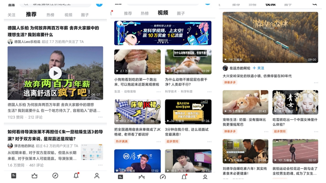 和微博、微信相比,除了在界面及创作者激励方面存在显而易见的不同,长期以来,平台用户养成的偏好需求,以及知乎创作者提供的内容属性,都是知乎视频重要的竞争力。