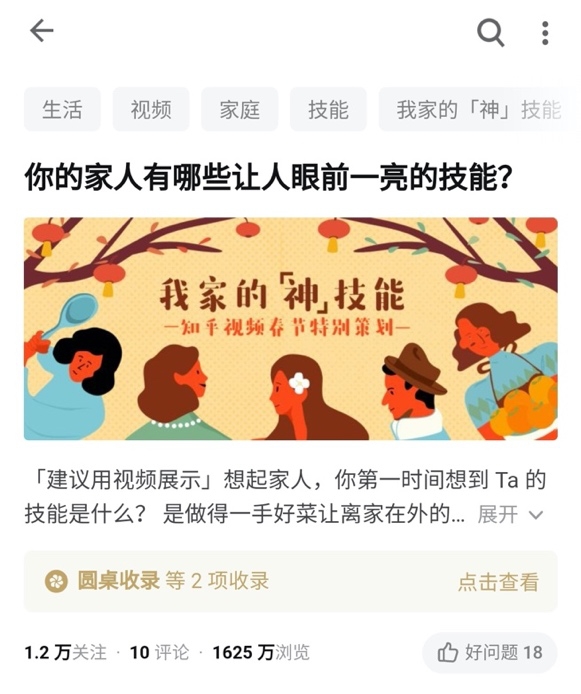 2018年2月,知乎官方账号@知一声发布文章《用知乎视频工具,轻松拍视频》,启动知乎视频创作、回答功能。官方发起话题“用视频回答:「你的家人有哪些让人眼前一亮的技能」”,累计获得用户1625万次浏览,并有超过800位答主提供了近千条内容丰富的视频。