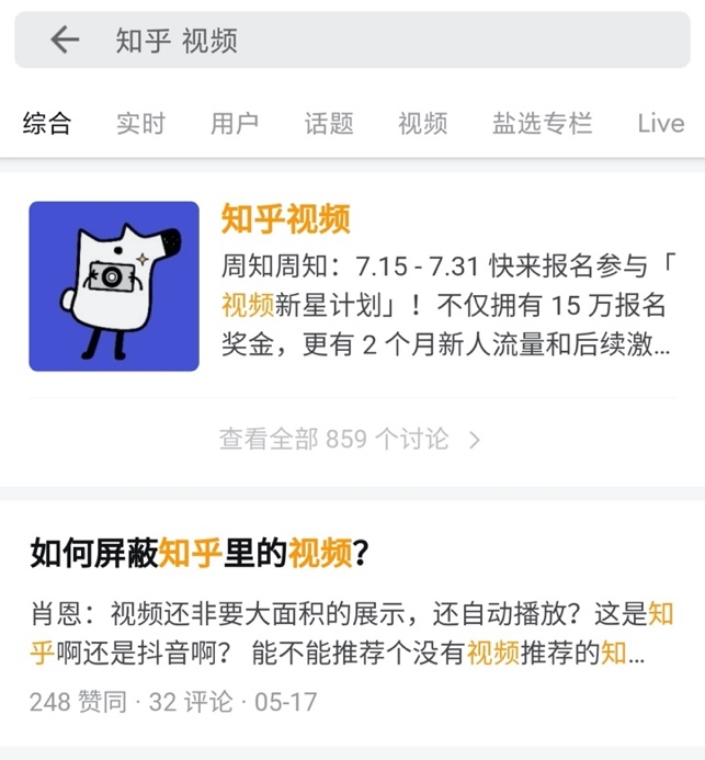 在知乎上搜索“知乎 视频”关键词,跳出来第一个问题竟然是“如何屏蔽知乎里的视频”。下面的回答几乎清一色是类似的吐槽,让人隔着屏幕也能感觉到一丝丝尴尬。