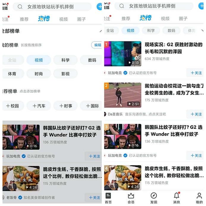 如果点开知乎的“热榜”专区,会看到“视频”内容也被单独聚合成一个子集,默认显示位置优先于“科学”、“数码”等其他子集内容。而“视频”一栏中除了显示视频标题和热度外,还会注明视频作者以及引导关注。