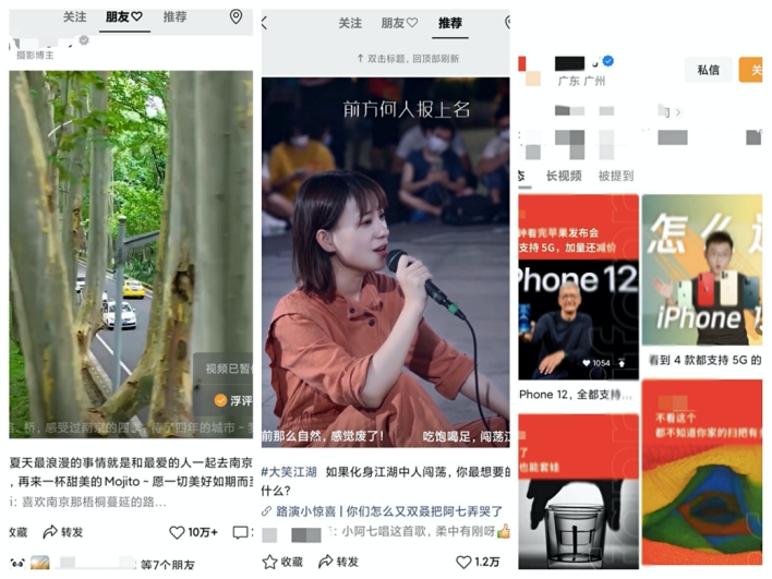 微信视频号共有三个子分区:关注、朋友点赞、推荐。三个分区均以瀑布流的形式推送视频。默认用户先进入第二个分区,显示微信好友赞过的视频。