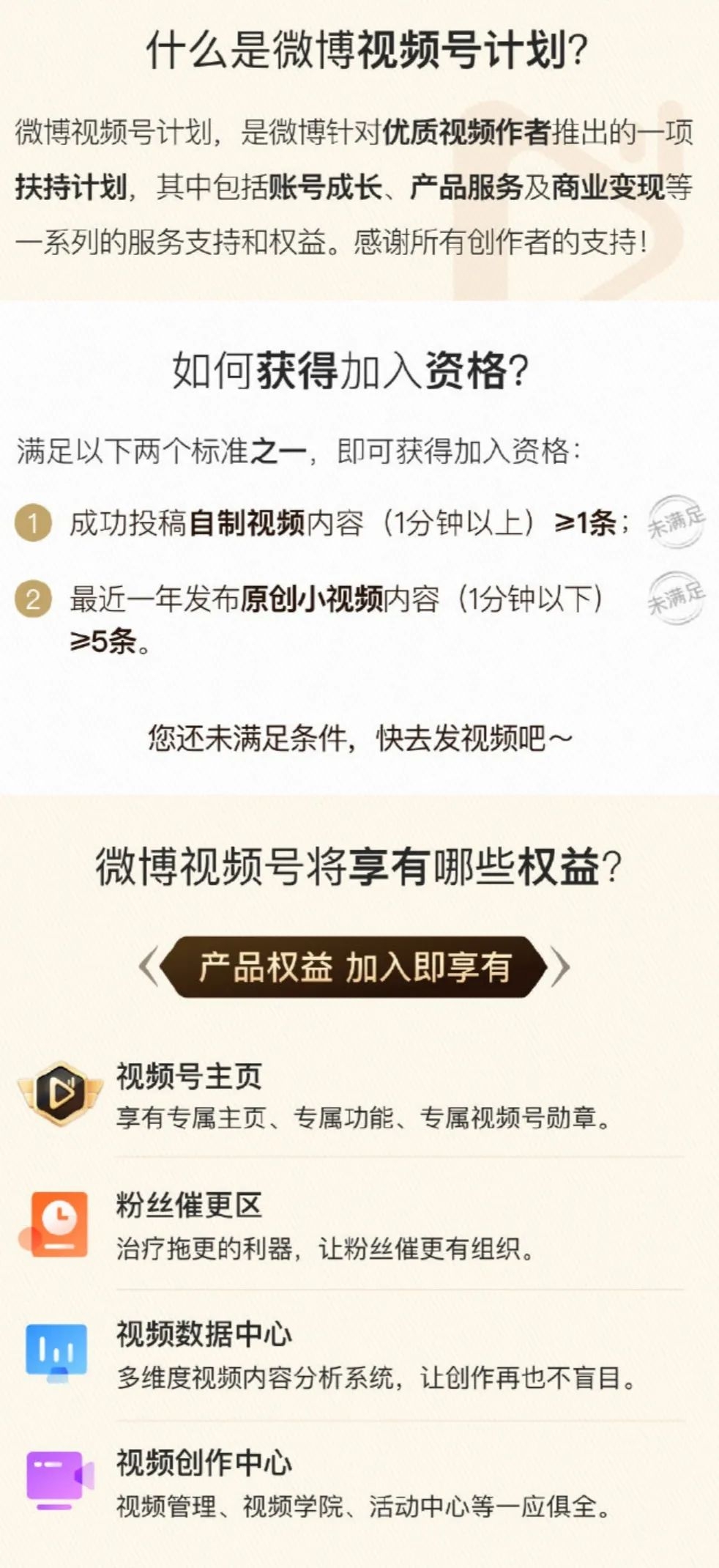 为了培养视频创作者,新浪微博在今年下半年启动“微博视频号计划”,通过广告分成、流量扶持、维权保护等激励机制,向全行业优质视频创作者伸出橄榄枝,满足条件的微博视频创作者即可升级为微博视频号。