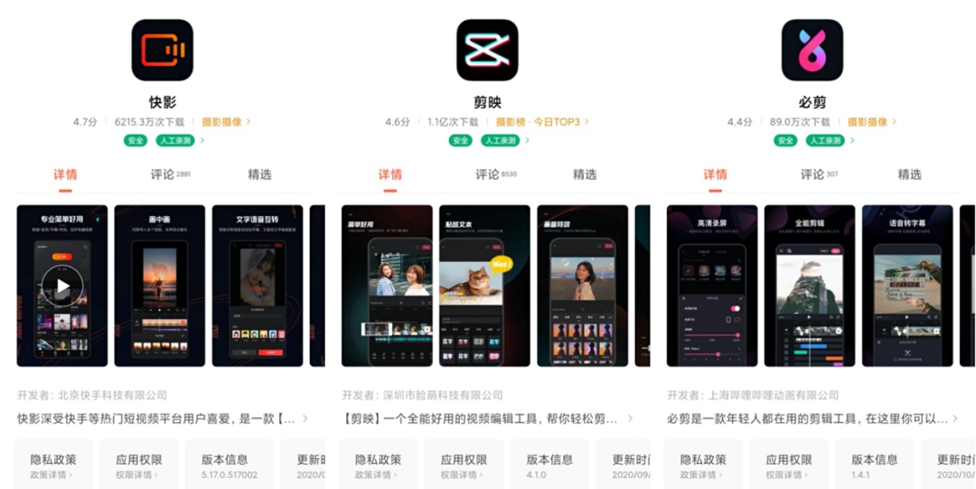 除了对视频创作者的现金激励,知乎也将目光放在了创作工具的变革上。现如今,市面上的头部短视频争相在为用户提供视频剪辑工具,例如剪映(抖音旗下)、快影(快手旗下)、必剪(B站旗下)。据某安卓应用市场显示,热度最高的剪映已经超过1亿次下载量。