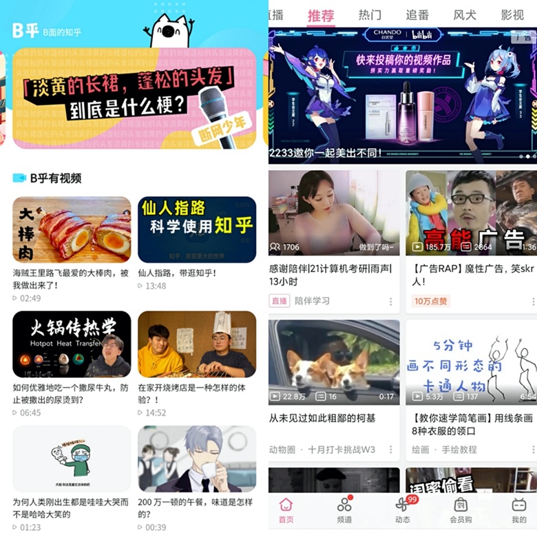 不少用户发现,“B乎”模式和隔壁的B站相比,似乎有莫名的相似之处。首先在排版方面,双方的最上方均为轮播banner,下方则是两列视频矩阵,视频的内容涉猎广泛,长/短视频都有。有人吐槽说,感觉知乎直接把B站整个搬进来了,B乎、B站傻傻分不清。