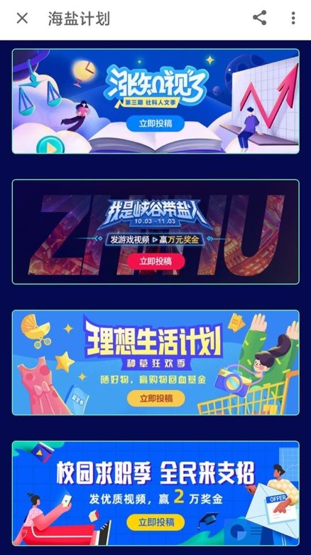 在本次知乎“海盐计划”中,设有面向财经、人文、法律领域的“涨知视了:社科人文季”、面向科学、心理、健康领域的“2020科学季:致知计划”以及面向游戏/电子竞技领域的“S10·峡谷带盐人”等8个知识类视频创作激励活动。