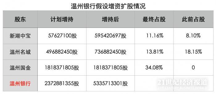 按照温州银行此次方案测算,温州银行此次股份发行上限为2372881355股,完成后总股份为5335713301股,完成后温州名城、新湖中宝的持股比例分别为13.81%、11.16%。假设其他股份均被温州国金认购,则其持股比例为34.08%,将成为第一大股东,耗资约53.64亿元。