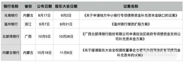 21世纪经济报道记者梳理发现,截至目前有3省4家城商行发布了用地方债补充资本金方案的公告,分别为温州银行、北部湾银行、乌海银行、内蒙古银行,其中乌海银行、温州银行已经召开完股东大会。