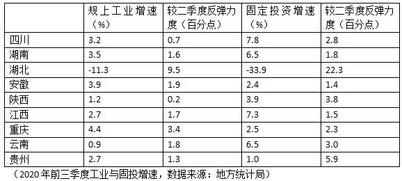 从综合情况看,四川和重庆的综合指标领先其他省市。在规模以上工业增速方面,前三季度,重庆的规模以上工业增速最高,达到4.4%,湖北负增长,为-11.3%,但湖北也是反弹力度最高的地区,三季度较二季度反弹了9.5个百分点。