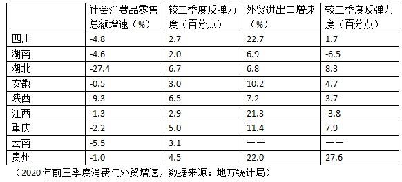 截至三季度末,上述9个省市的社会消费品零售总额增速依然为负,安徽以-0.5%的增速排名第一,而陕西则以-9.3%的增速排名最后。若以反弹力度看,陕西、重庆、贵州排名前三,分别为6.5个百分点、5.0个百分点、4.5个百分点。