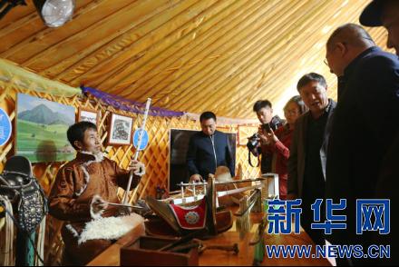 蒙古族手工艺人教游客制作马头琴、马鞍。新华网 曹桢摄