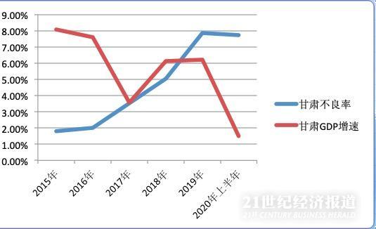 记者梳理发现,受产能过剩、企业生产下降影响,2011年以来甘肃GDP增速整体呈下行趋势,2017年经济增速下降4个百分点降至3.56%,当年不良率反弹1.5个百分点至3.51%。此后的2018年-2019年,甘肃GDP增速有所回升,但不良率仍在上行,至2019年末不良率达到7.86%。